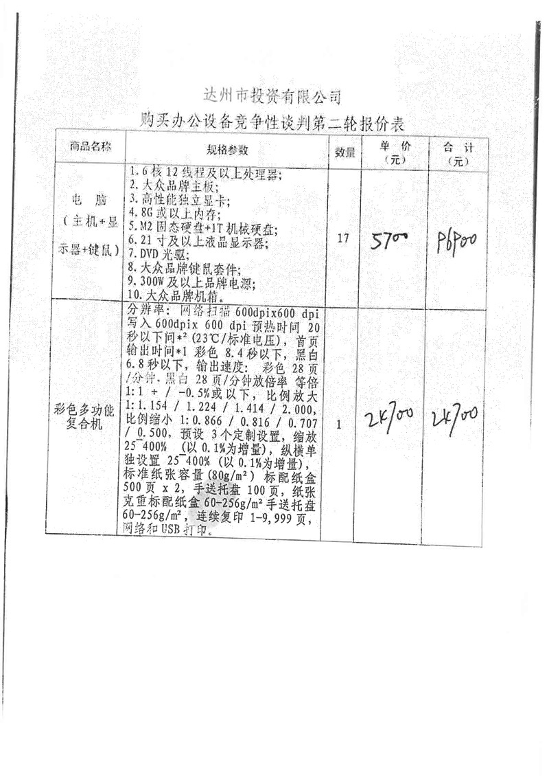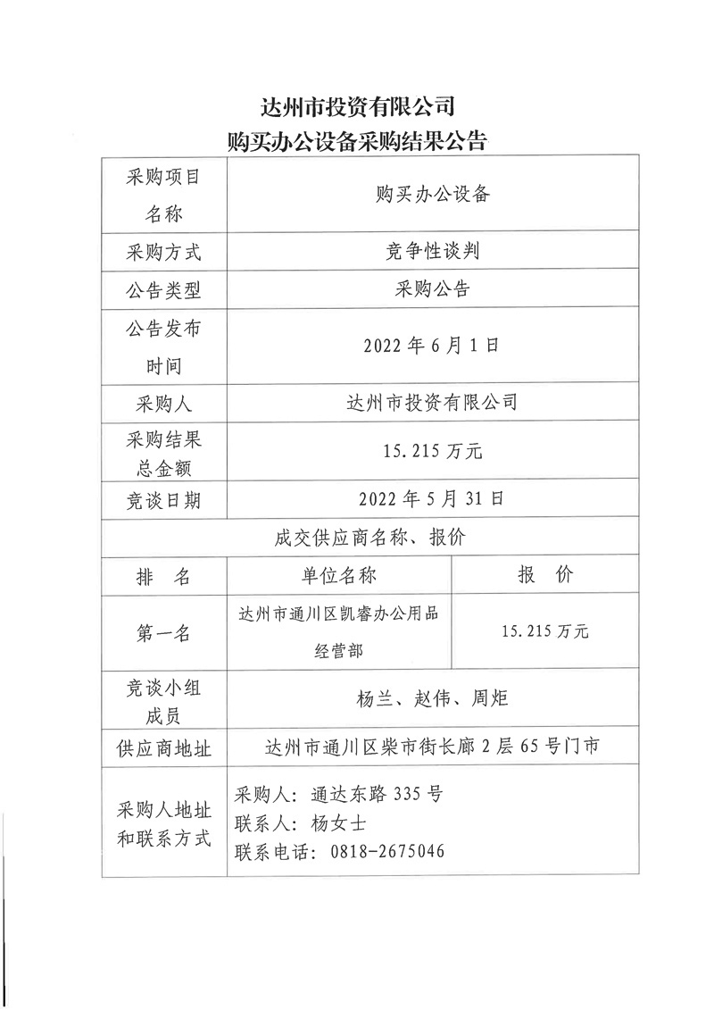 達(dá)州市投資有限公司購買辦公設(shè)備采購結(jié)果公告